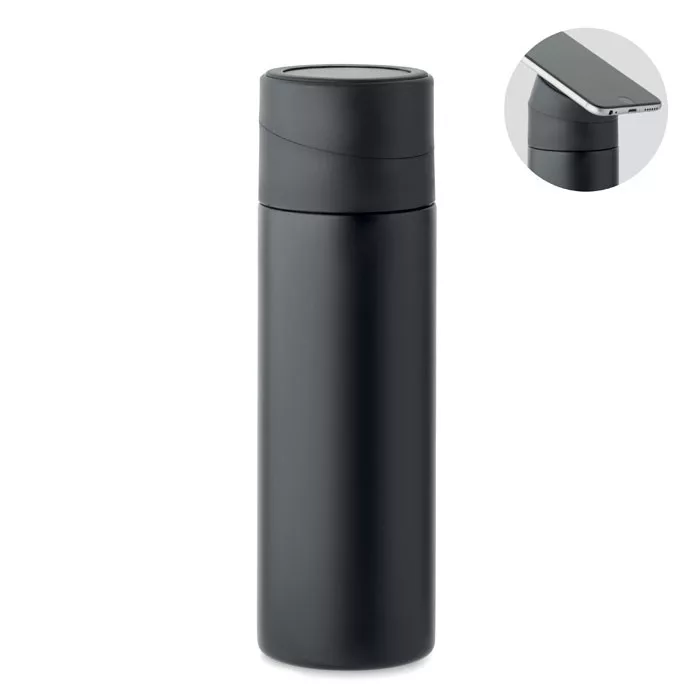 Duplafalú termoszpalack újrahasznosított rozsdamentes acélból (90% újrahasznosított rozsdamentes acél és 10% rozsdamentes acél), szilikon csúszásmentes telefontartó gyűrűvel a fedélen. Szivárgásmentes. Űrtartalom: 420 ml.