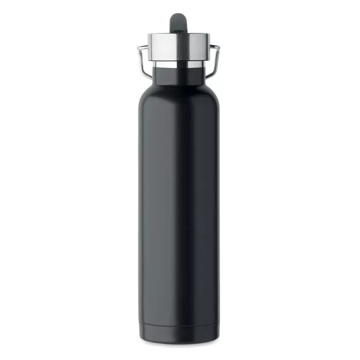 Duplafalú termoszpalack újrahasznosított rozsdamentes acélból (90% újrahasznosított rozsdamentes acél és 10% rozsdamentes acél), beépített szívószállal és fogantyús fedéllel.
