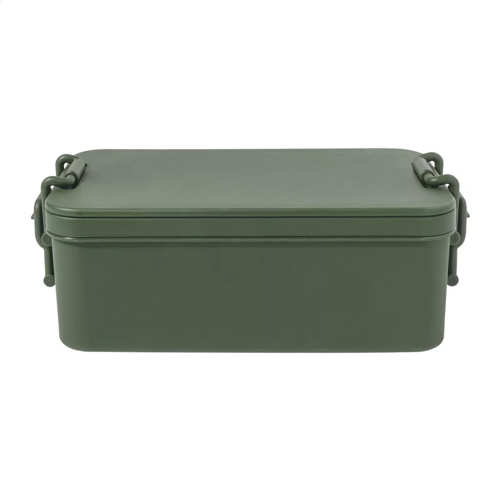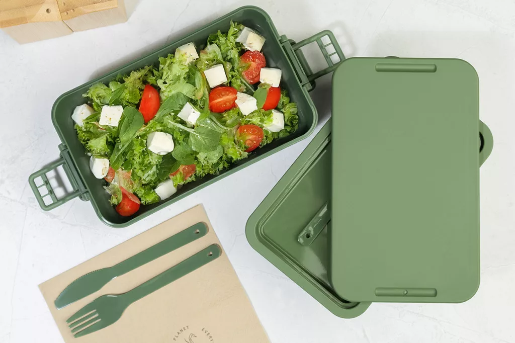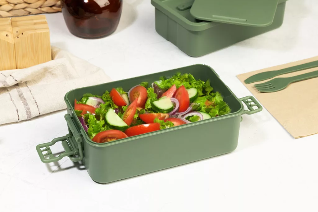 PP műanyag ételdoboz evőeszközkészlettel (villa, kanál és kés), csatos zárral és 2 rekesszel (1000 ml és 800 ml). Egymásra rakható kialakítással a kompakt tárolás érdekében.