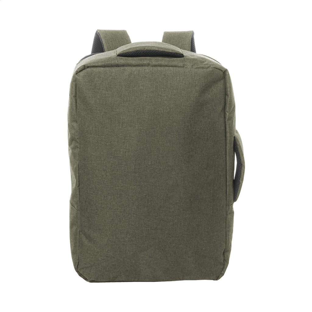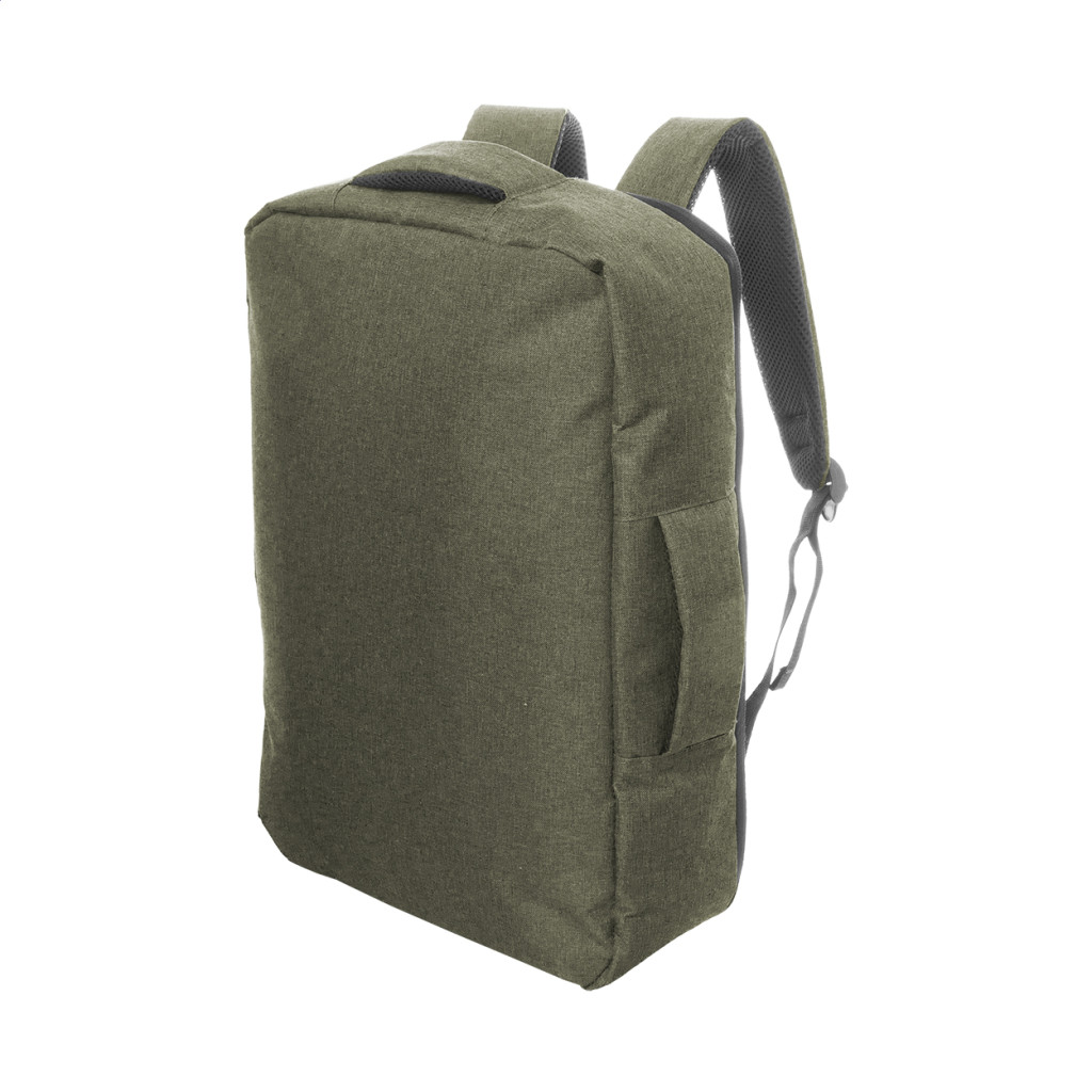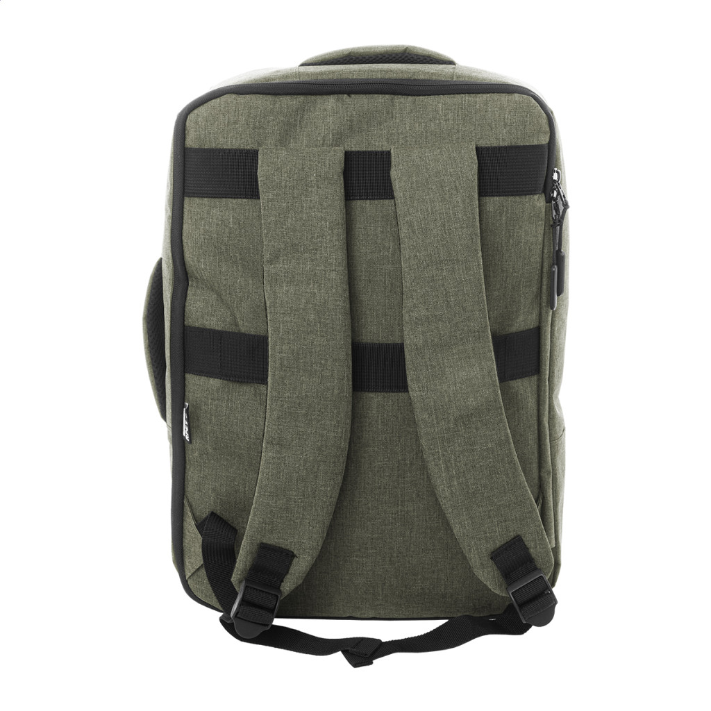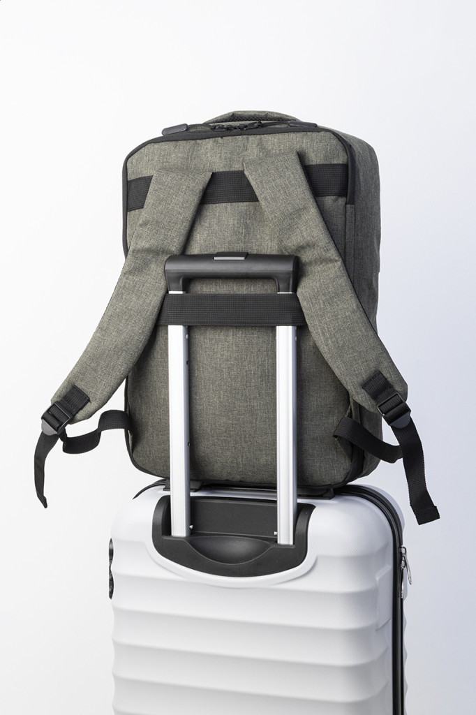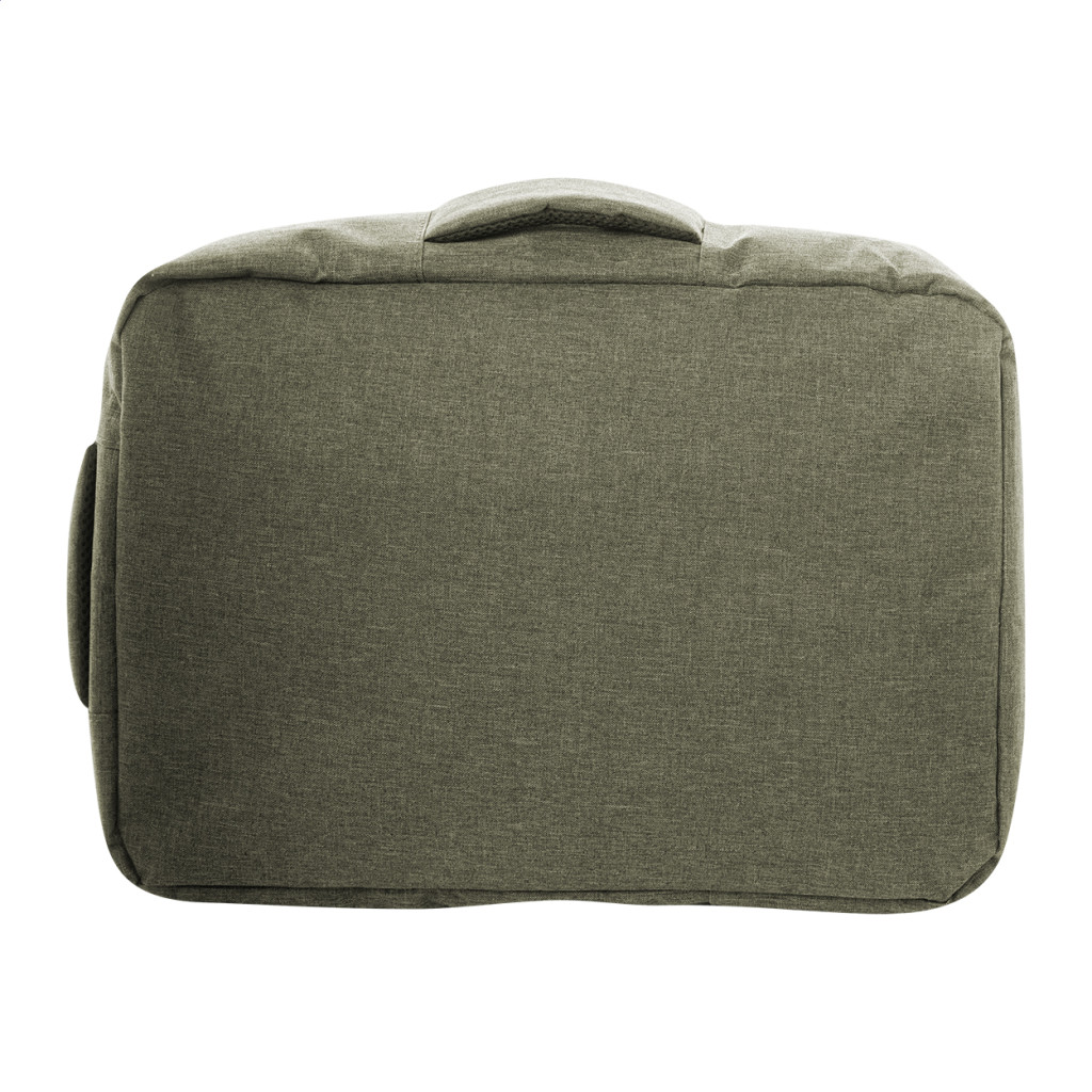 Kétfunkciós RPET hátizsák és irattáska cipzáras rekesszel és párnázott laptoprekesszel (15") Bőröndre rögzíthető szíjjal, párnázott hát- és vállpántokkal. 300D RPET poliészter, megkülönböztető RPET címkével.