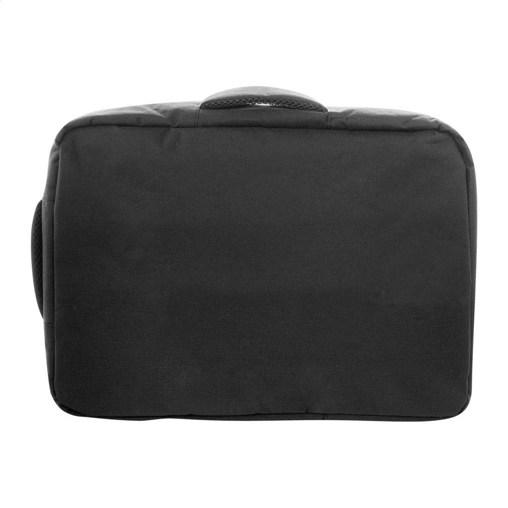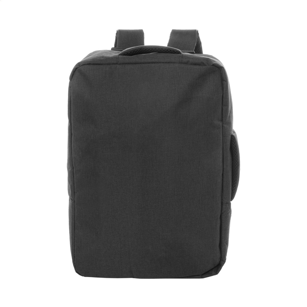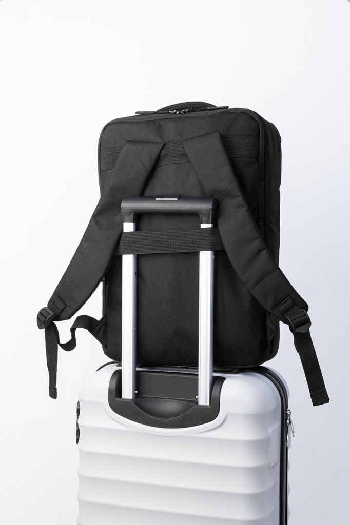 Kétfunkciós RPET hátizsák és irattáska cipzáras rekesszel és párnázott laptoprekesszel (15") Bőröndre rögzíthető szíjjal, párnázott hát- és vállpántokkal. 300D RPET poliészter, megkülönböztető RPET címkével.