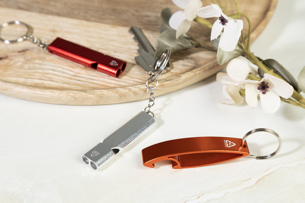 Újrahasznosított alumínium üvegnyitó fém kulcskarikával.