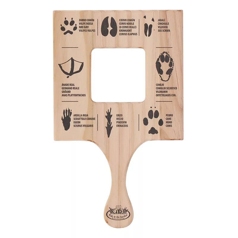 Fából készült állatnyom olvasó gyerekeknek, 12 x 20 cm. Ez a fa keret lehetővé teszi az állatok által hagyott nyomok kutatását és tanulmányozását. A keret hátulján több nyelven is szerepelnek az ismeretterjesztő leírások, így nyelvtanulásra is alkalmas kiegészítő.