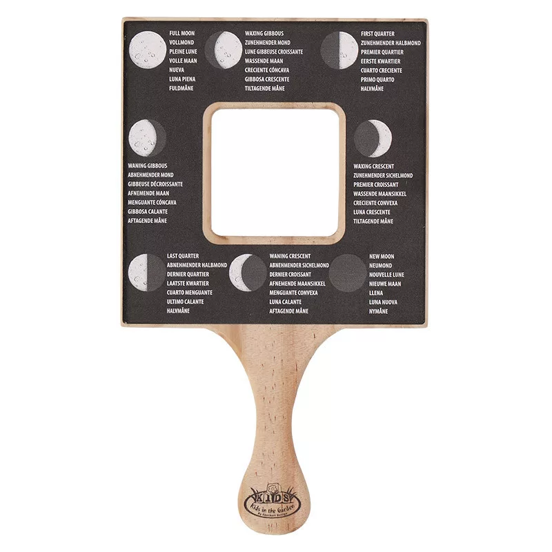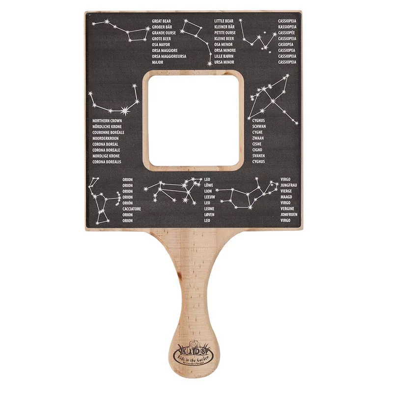 Fából készült csillagkép és holdfázis olvasó gyerekeknek, 12 x 20 cm. Használatához egyszerűen tartsuk ezt a fakeretet a csillagos ég felé, és keressük meg a nyolc leghíresebb csillagképet. A keret hátulján az aktuális holdfázist vizsgálhatjuk meg.