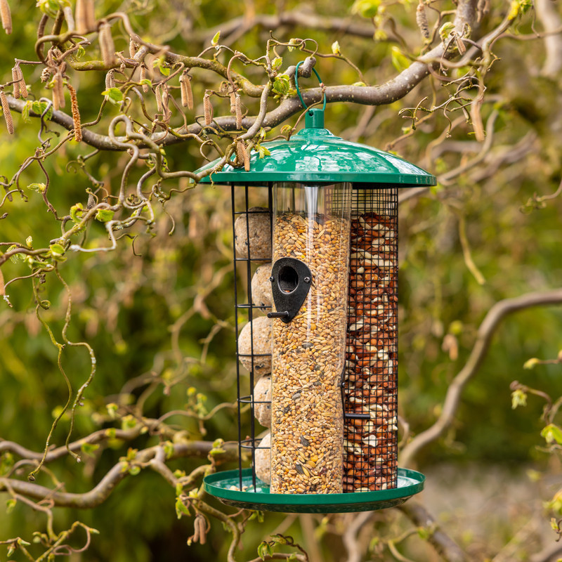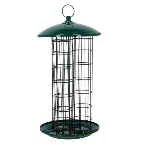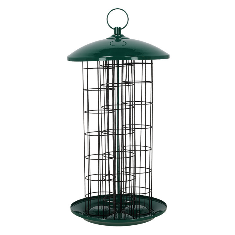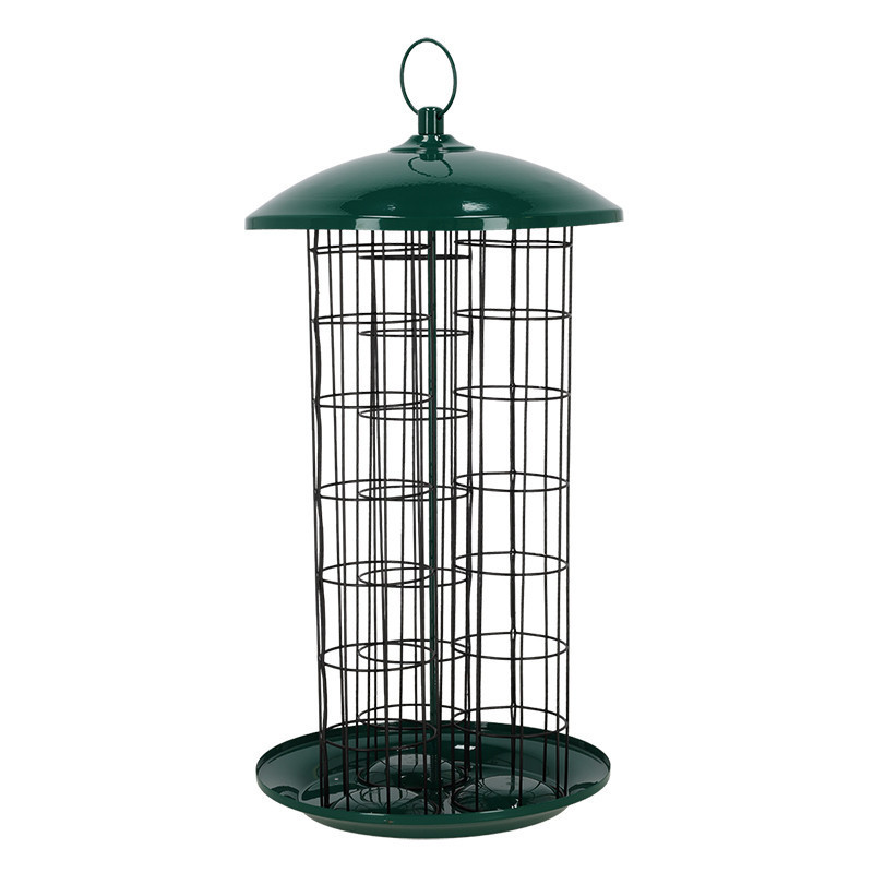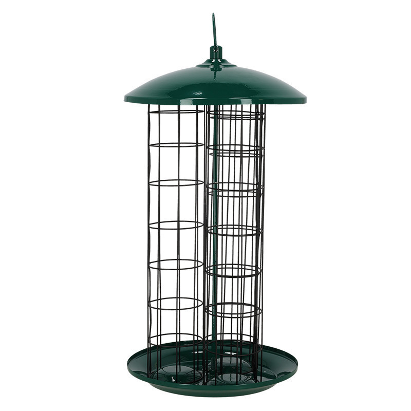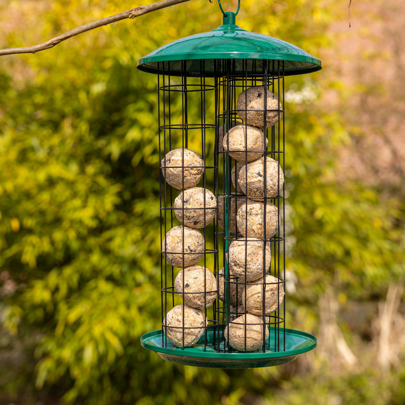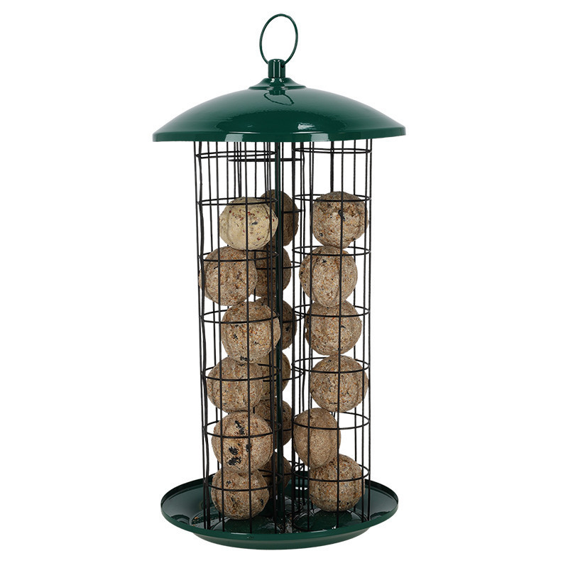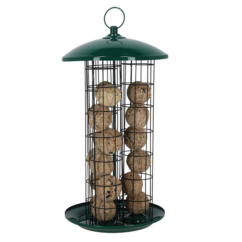 Felakasztható adagolós madáretető faggyúgolyóknak. A madáretetőbe egyszerre 24 darab faggyúgolyó helyezhető. A tetején lévő karikán keresztül könnyen felakasztható, az etető körül pedig a kismadarak könnyen megkapaszkodhatnak. Kialakításának köszönhetően a madáreleség szárazon marad és bármikor újratölthető. Az alsó tálca segít összegyűjteni a lehullott magokat, melyet a madáretető alján lévő nyílás segítségével pótolhatunk. A dekoratív madáretető nemcsak a dalos kismadarakat vonzza a ház köré, de a kert különleges dísze is lehet. A termék a madáreleséget nem tartalmazza.