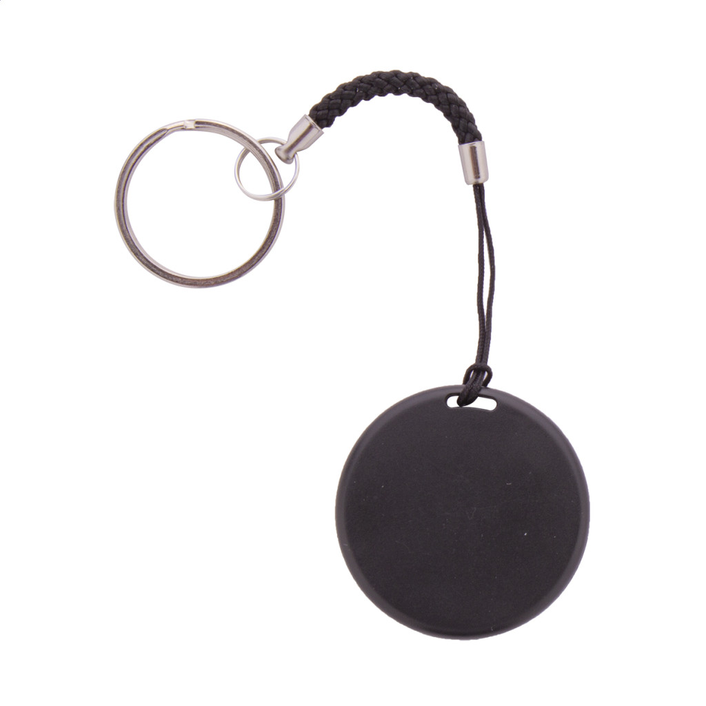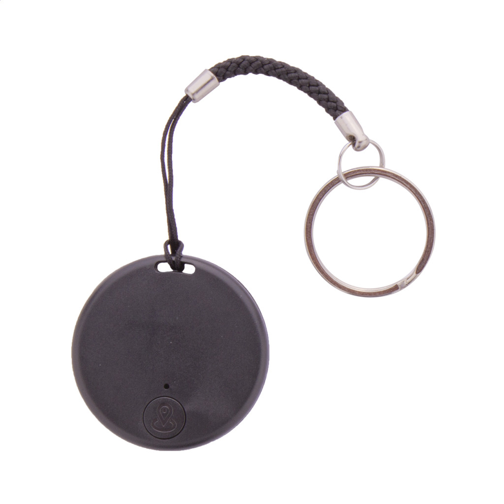 Kulcskereső eszköz vezeték nélküli kapcsolattal, kamera exponáló funkcióval, kör alakú műanyag borításban. Zsinórral és fém karikával. Gombelemmel szállítjuk. Ingyenes iOS / Android applikációval működik.