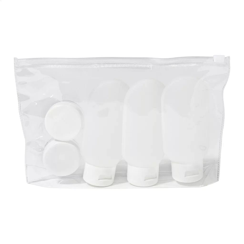 Úti kozmetikai szett cipzáras, átlátszó PVC tasakkal és 5 újratölthető tartállyal. Tartalmaz 3 üveget (60 ml) és 2 tégelyt (10 ml). Ideális piperecikkek rendszerezéséhez repülőtéri biztonsági ellenőrzéshez.