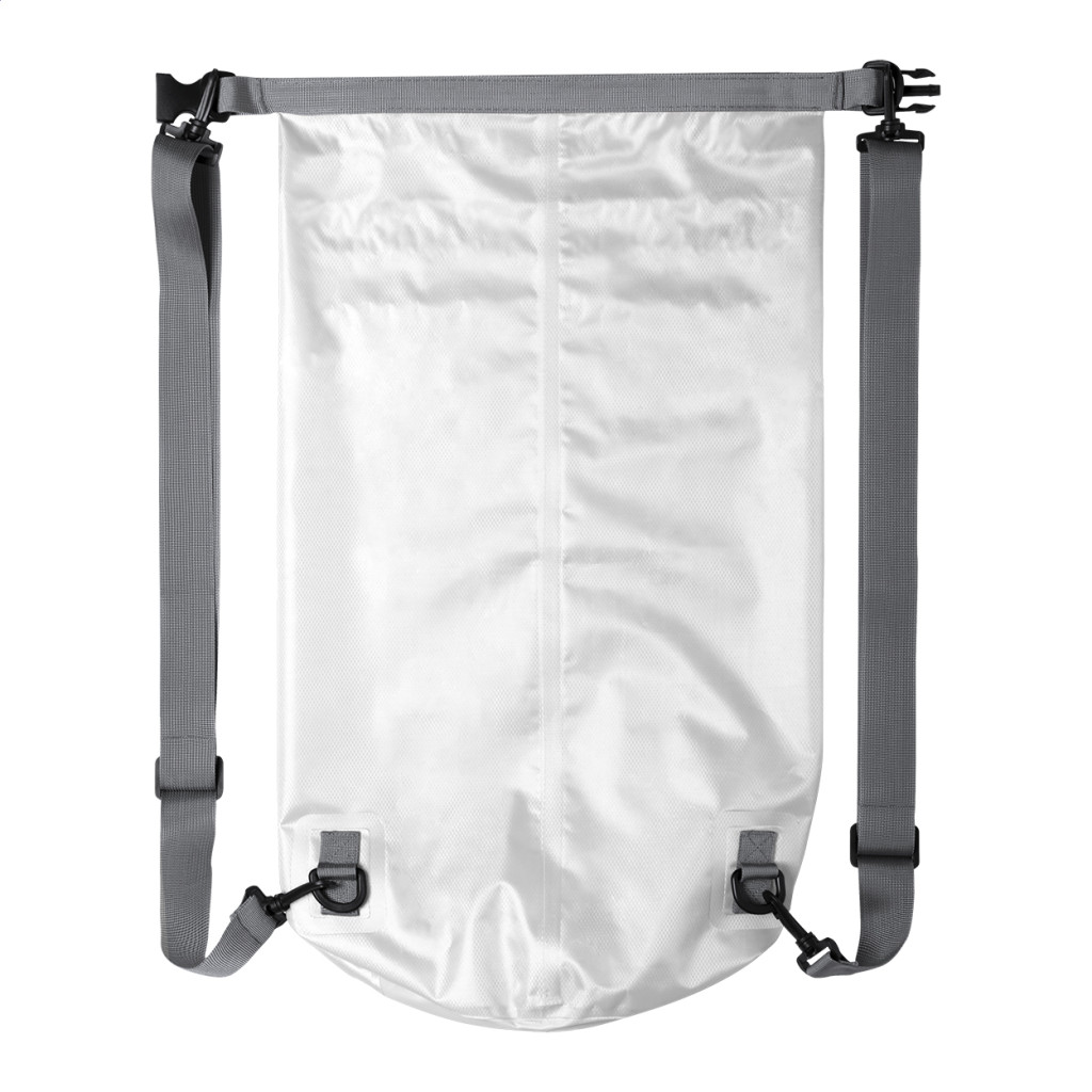Vízálló hátitáska állítható vállpántokkal és műanyag csattal.