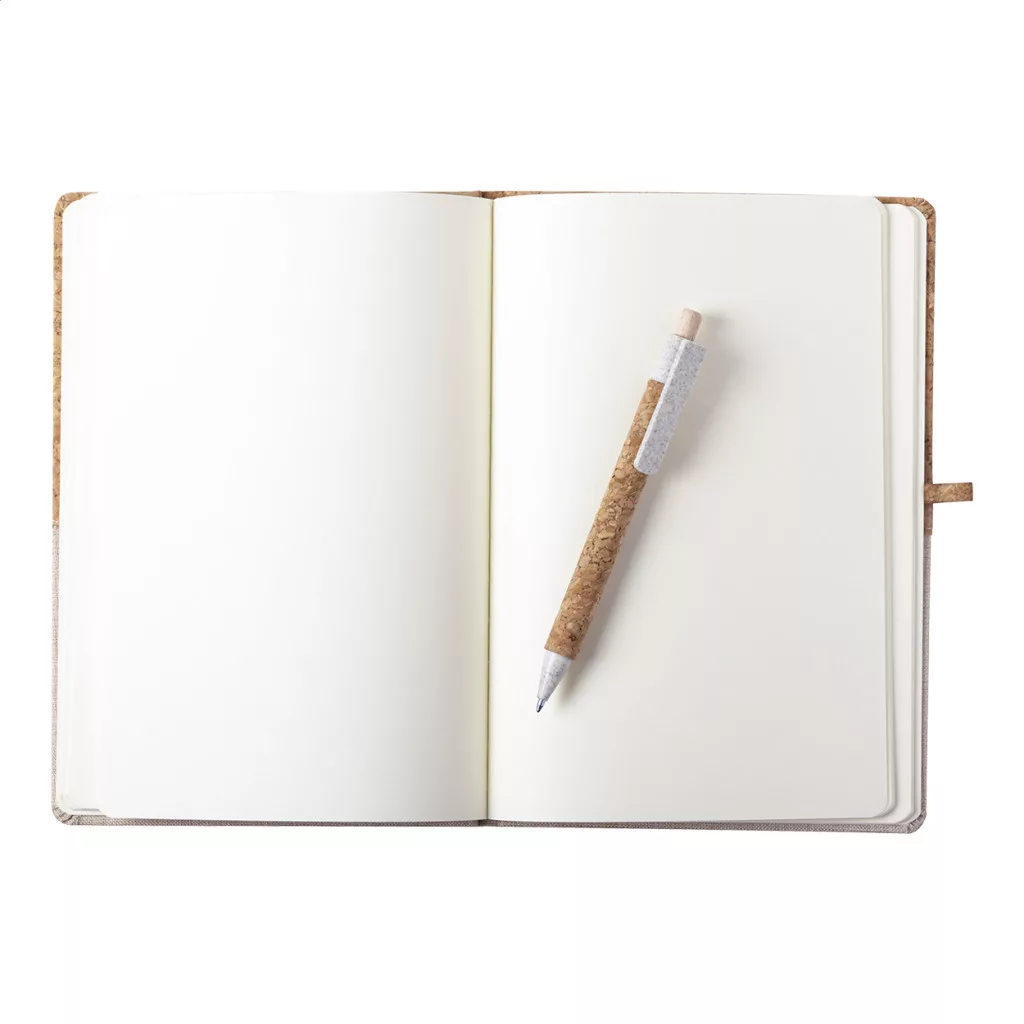 Természetes parafa és pamut bevonatú jegyzetfüzet 80 sima A5 méretű lappal. Tartalmaz egy parafával borított búzaszalma műanyag golyóstollat, fekete tollbetéttel.