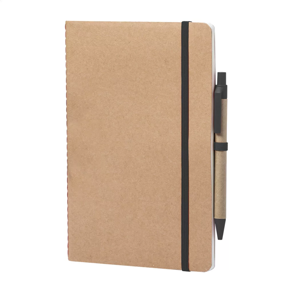 Újrahasznosított karton borítású jegyzetfüzet 60 sima lappal és színes gumipánttal, A5 méretű. Búzaszalma műanyag golyóstollal, kék tollbetéttel.