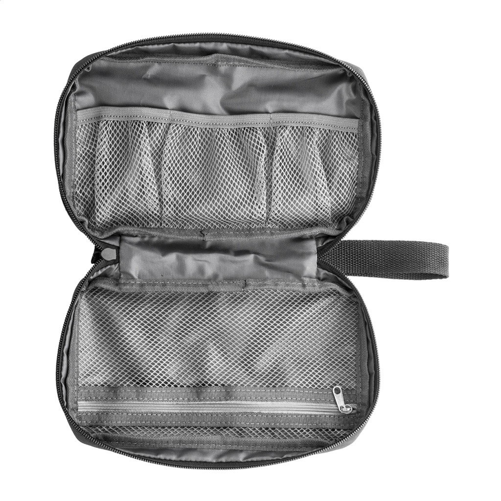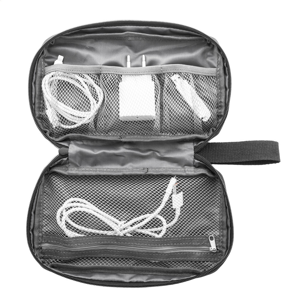 Cipzáras RPET kábelrendező tok hálós belső rekeszekkel és cipzáras elülső zsebbel. 600D RPET poliészter, megkülönböztető RPET címkével.