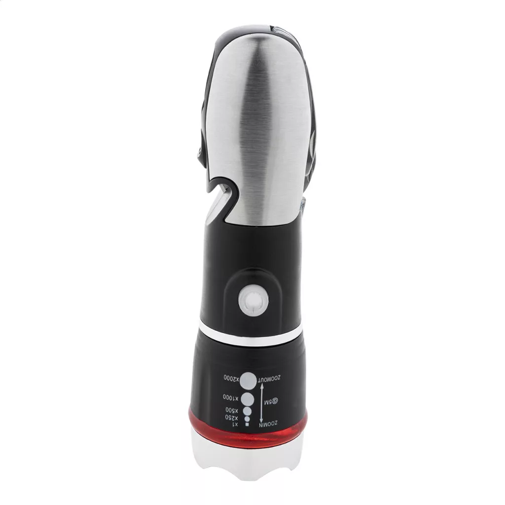 ABS-ből és rozsdamentes acélból készült multifunkcionális zseblámpa vészkalapáccsal, biztonsági övvágóval és multiszerszámmal, 9 funkcióval. Zoomolható LED világítással és 3 fénymóddal. 3 db AAA elemmel működik, elem nélkül szállítjuk.