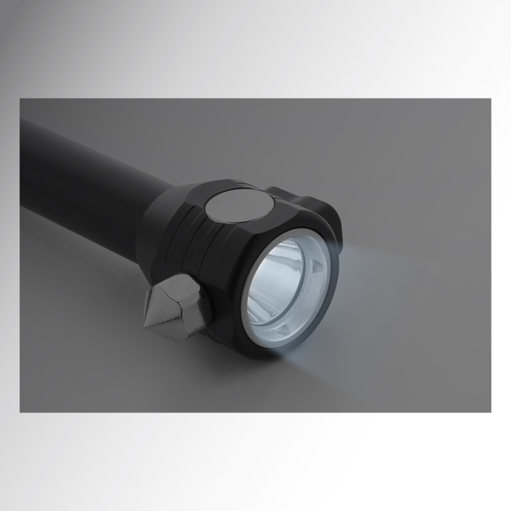 3 az 1-ben alumínium zseblámpa vészkalapáccsal és biztonsági övvágóval. Beépített USB újratölthető akkumulátorral (500 mAh), mágnessel és hordszíjjal. Nagy teljesítményű COB lámpával az elején és COB reflektorral az oldalán. USB töltőkábellel.
