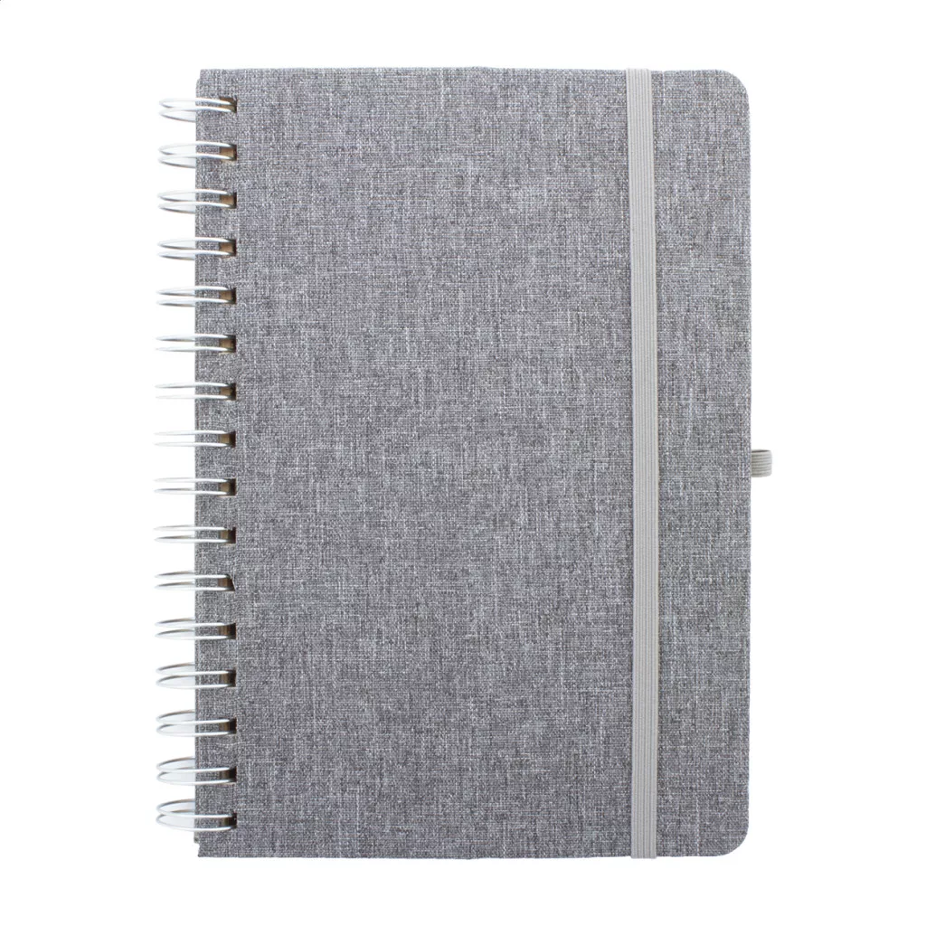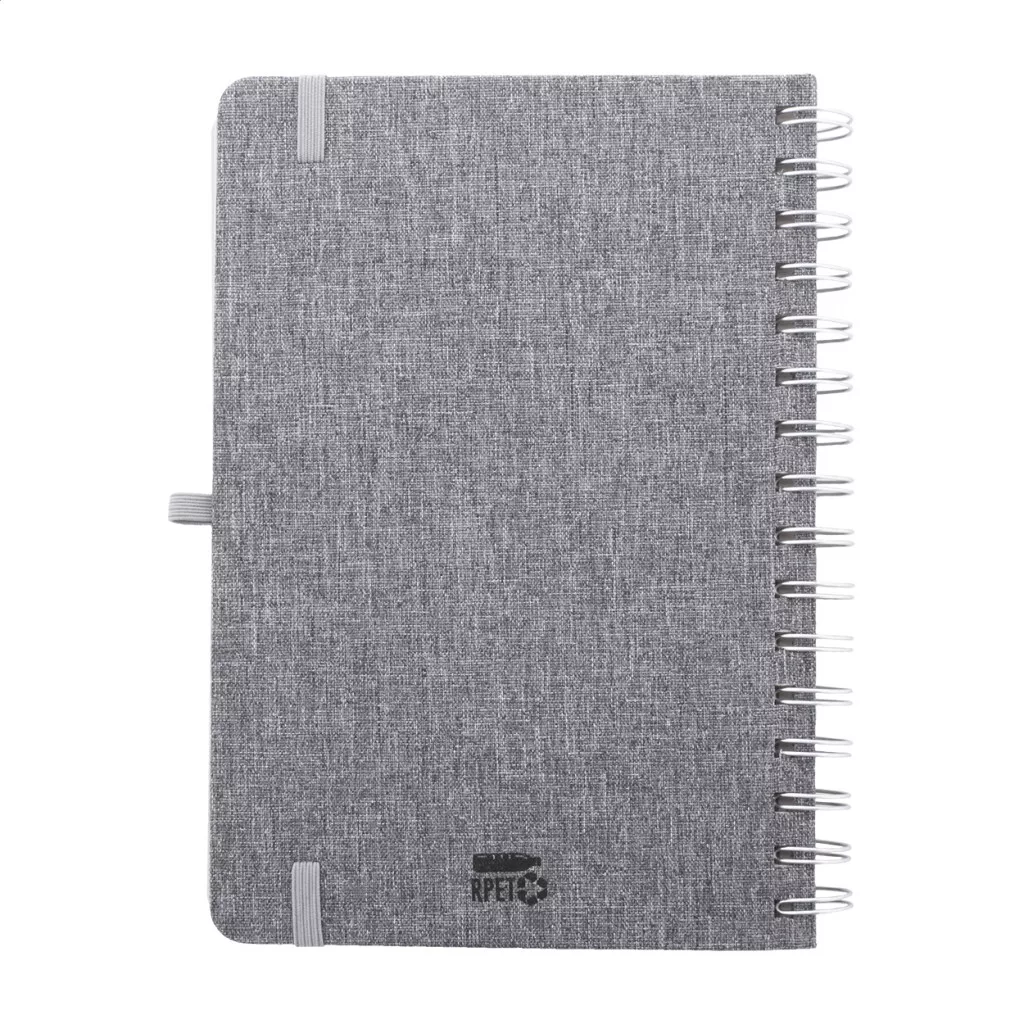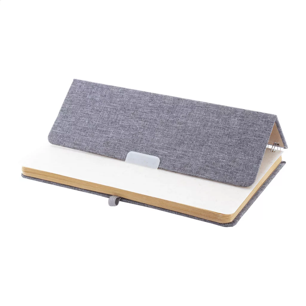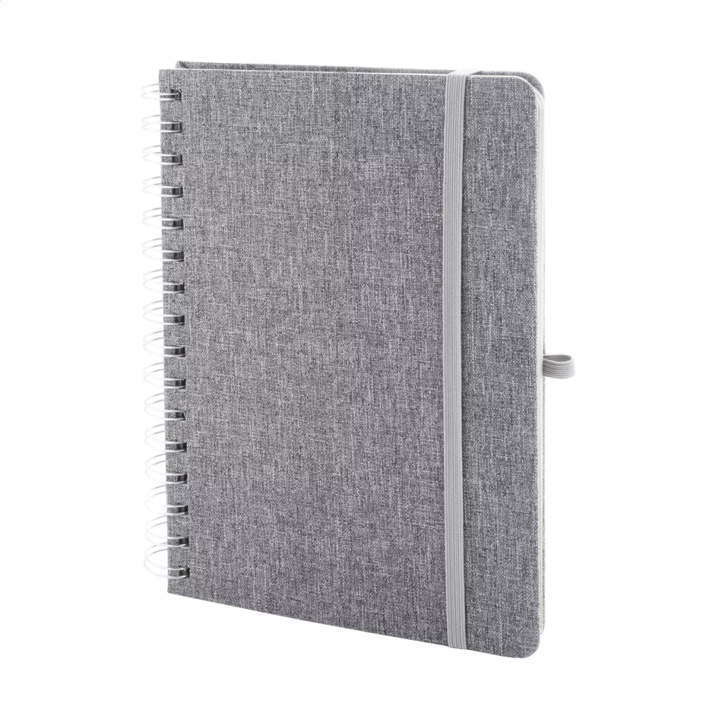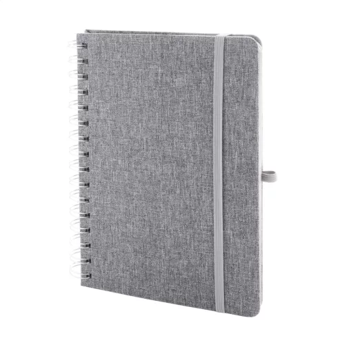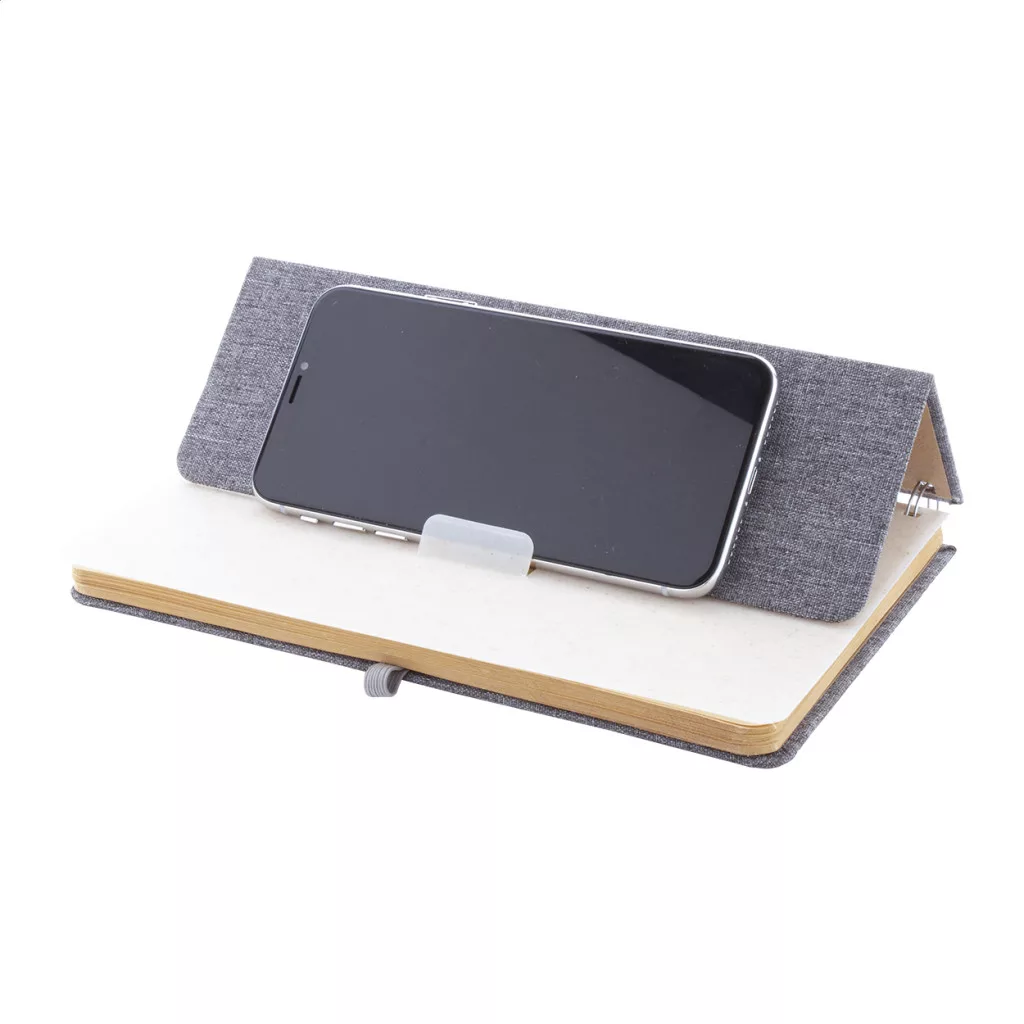 RPET poliészter borítású spirál jegyzetfüzet, búzaszalma műanyag telefon- és tablettartó betéttel. 70 újrahasznosított kraft papírból készült vonalas lappal, gumis pánttal és tolltartóval. A5 méretű.