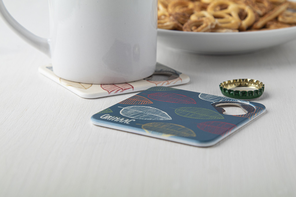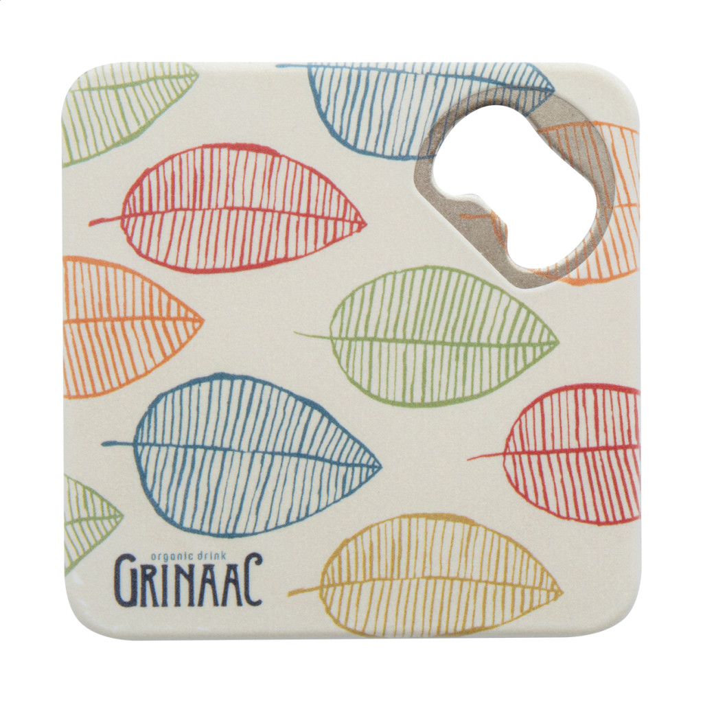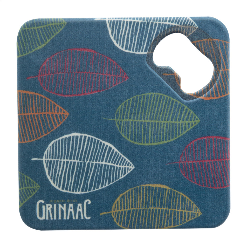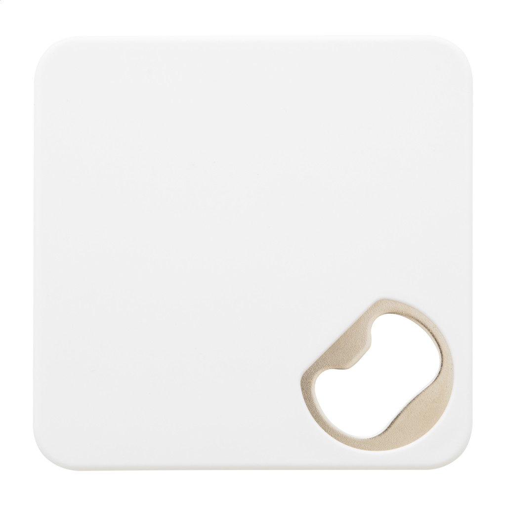 Műanyag poháralátét, sörnyitóval és csúszásmentes aljjal.