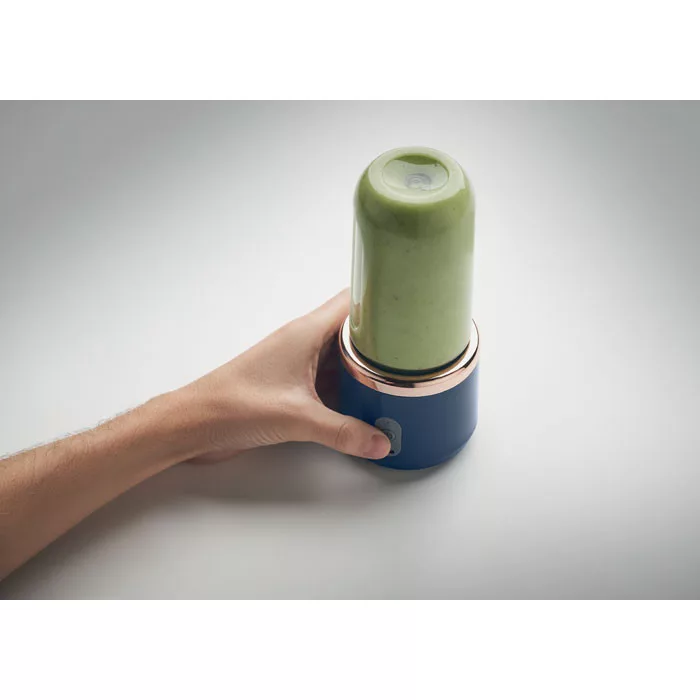 Hordozható smoothie készítő turmixgép, hatélű késsel, 2 kivehető PCTG keverőpohárral, pánttal ellátott fedéllel. BPA mentes. USB-n keresztül újratölthető 1200 mAh akkumulátor. Űrtartalom: 400ml (2x).