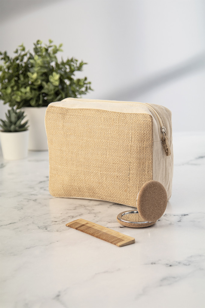 Cipzáras kozmetikai táska pamutból és laminált jutából.