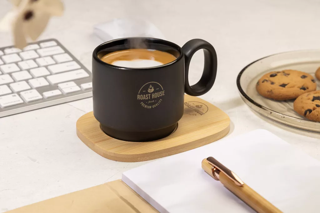Kiváló minőségű kerámia bögre matt külső és fényes belső felülettel. Bambusz tálaló tálcával. 220 ml. Kraft papír dobozban.