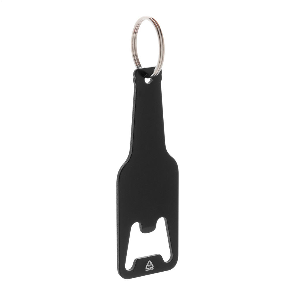 Palack formájú, újrahasznosított alumínium üvegnyitó fém karikával.