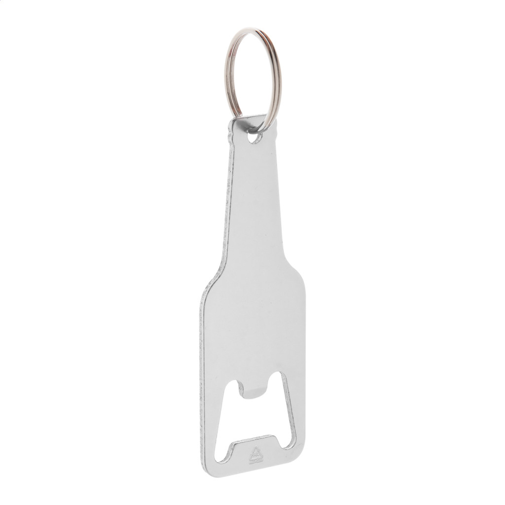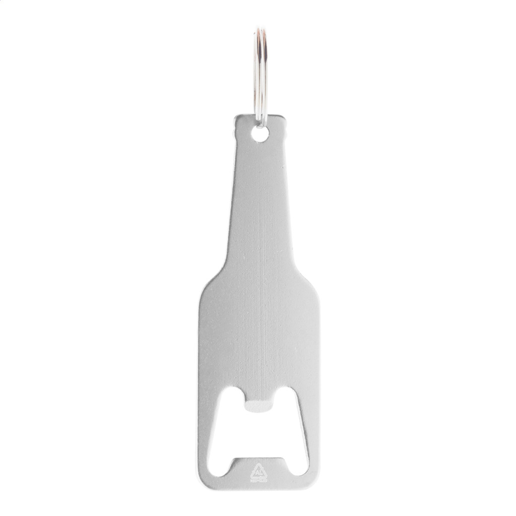 Palack formájú, újrahasznosított alumínium üvegnyitó fém karikával.