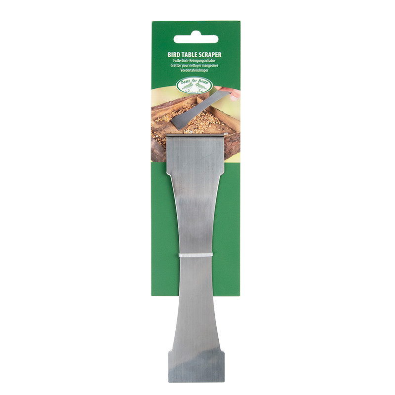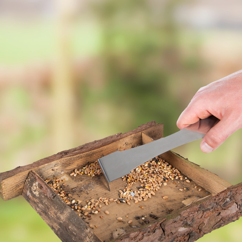 Rozsdamentes acél kaparó eszköz madáretetőkhöz és madárházakhoz. Praktikus eszköz, amellyel az etetőre tapadt régi madáreleséget és egyéb szennyeződéseket könnyen ki lehet takarítani. Fontos, hogy a madáretetőket és a házakat is megfelelően kitisztítsuk időközönként, higiéniát biztosítva a madaraknak.