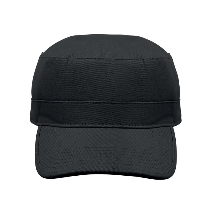 Katonai stílusú sapka 260 g/m² fésült pamutból, poliészter izzadságfelszívó pánttal, állítható tépőzáras záródással.