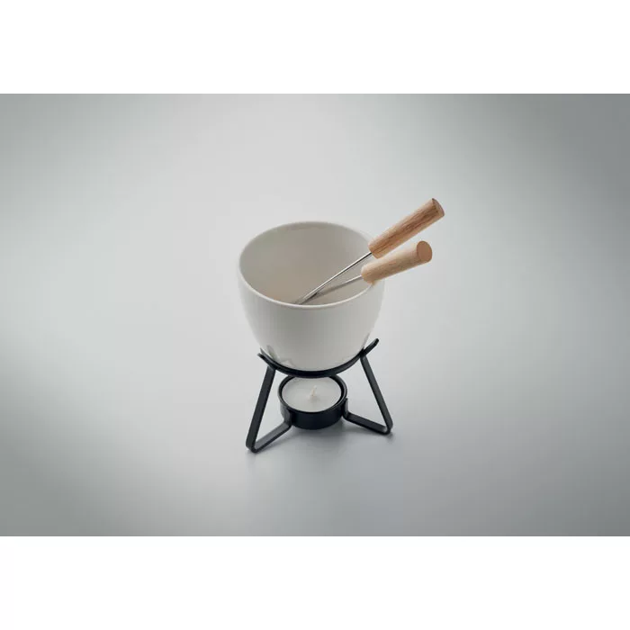 Kis kerámia fondü készlet két személyre. Két fanyelű fém villát tartalmaz. Teamécses nélkül szállítjuk. Űrtartalom: 240 ml.
