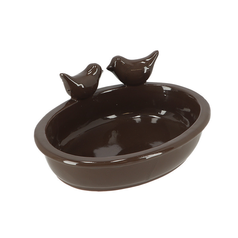 Kerámia madáretető és itató, barna színben. Mázas kerámia madáretető, melyet eleség és víz kihelyezésére egyaránt használhatunk. Kedves kismaradaras díszítésének köszönhetően gyönyörű kerti dekoráció, melyben a kertünkbe vagy az erkélyre látható madarak és pillangók is örömüket lelik majd. Kellemes bézs árnyalatával tökéletesen illik minden kertbe. Gondoskodjunk néhány naponta a friss madáreleség és a tiszta víz kihelyezéséről, és ne feledkezzünk meg a madáretető rendszeres tisztításáról sem! Hideg időjárás esetén nem ajánlott a terméket a szabadban hagyni, mivel a fagy okozhat sérülést vagy repedést a kerámia felületén.