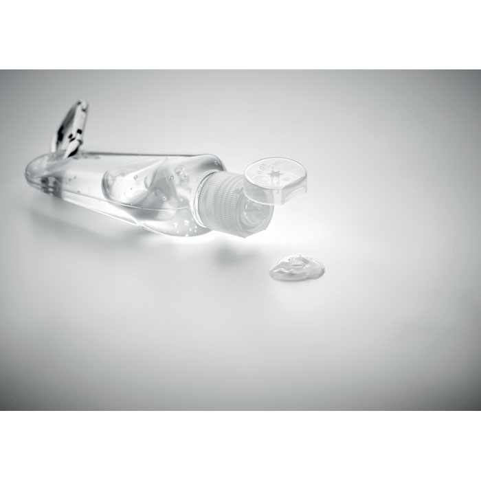 Kéztisztító gél flip top (ráütős) kupakos, újratölthető PET flakonban, karabinerrel. Űrtartalom 30 ml.