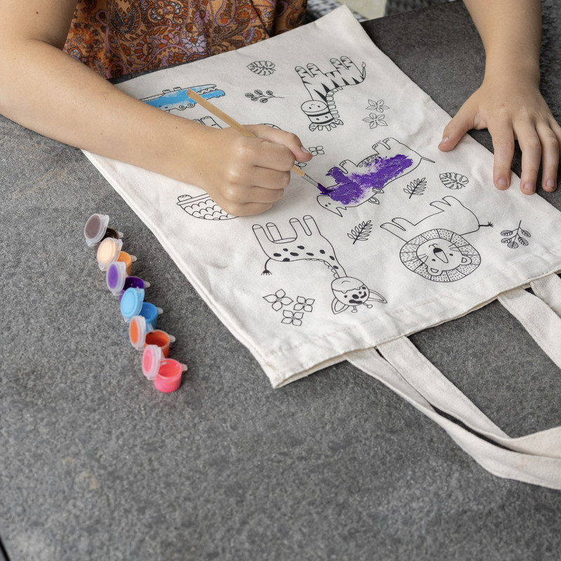 A táska erős vászon anyaga biztosítja a tartósságot, és elegendő helyet kínál a gyerekek személyes dolgainak. Miután elkészült a színezés, az alacsony hőmérsékleten való vasalás után a festékek rögzíthetők, így a táska mosógépben is tisztítható.