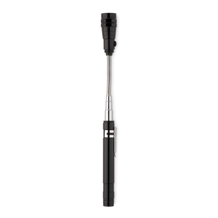 Kihúzható alumínium elemlámpa 3 LED izzóval, mágnessel a tetején és csíptetővel. Maximum hossz: 57 cm. A működéshez szükséges 4 db LR44 elemmel szállítjuk.