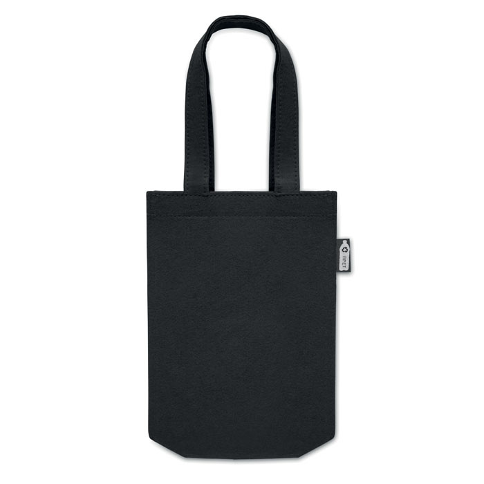 Kis, RPET filcből készült ajándéktáska rövid fülekkel, az alján toldással. Anyagvastagság: 1 mm.