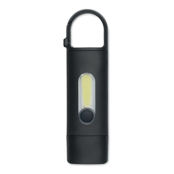 Kisméretű újratölthető COB zseblámpa karabinerrel, ABS-ből. Vészvilágítás és 3 világítási mód. 1 x 3,7 V, 200 mAh lítium beépített újratölthető akkumulátor.