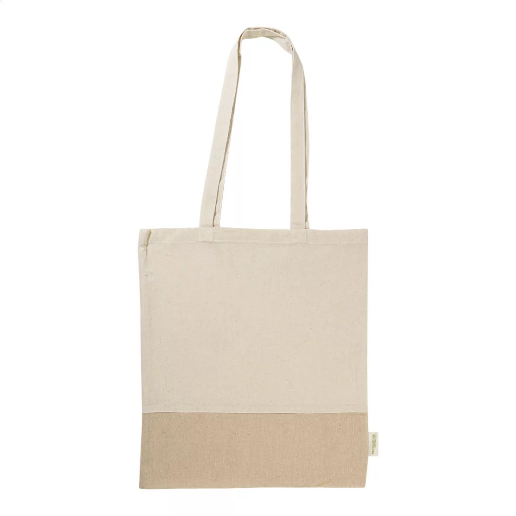 Kéttónusú, újrahasznosított pamut bevásárlótáska, hosszú hordfüllel, betoldással és megkülönböztető újrahasznosított pamut címkével. 100% újrahasznosított pamut, 120 g/m².