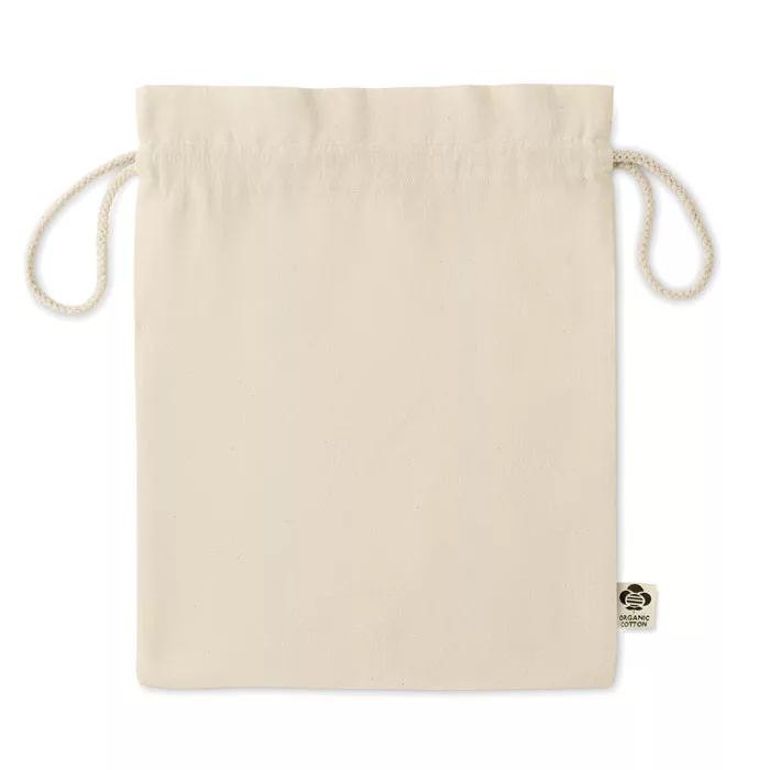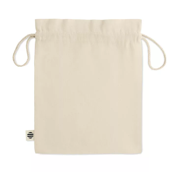 Közepes méretű húzózsinóros ajándéktasak biopamutból. Méret kb. 25x32 cm. 105 g vastag anyag.
