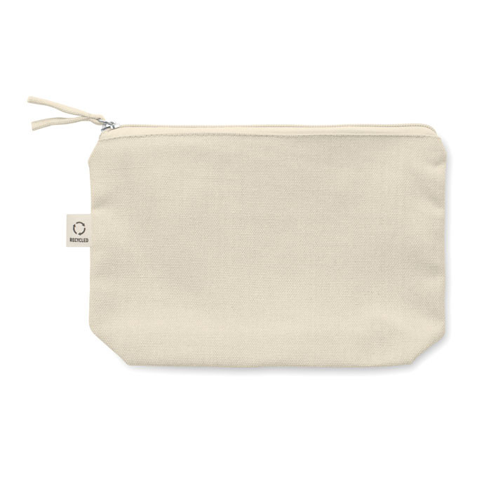 Újrahasznosított anyagból készült kozmetikai- vagy piperetáska (70% újrahasznosított pamut és 30% RPET poliészter), színazonos cipzárhúzóval. 320 g/m². Ez az anyag nyomtatás után zsugorodhat.