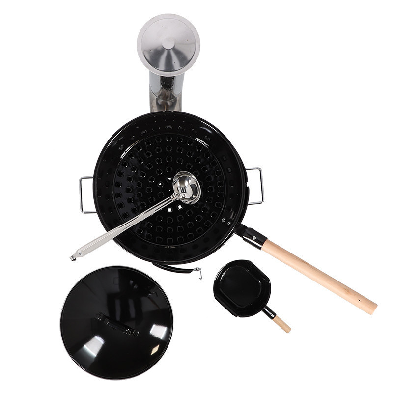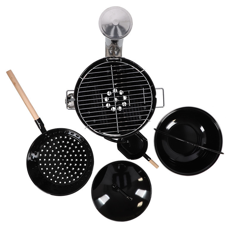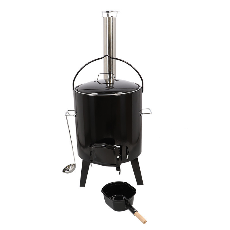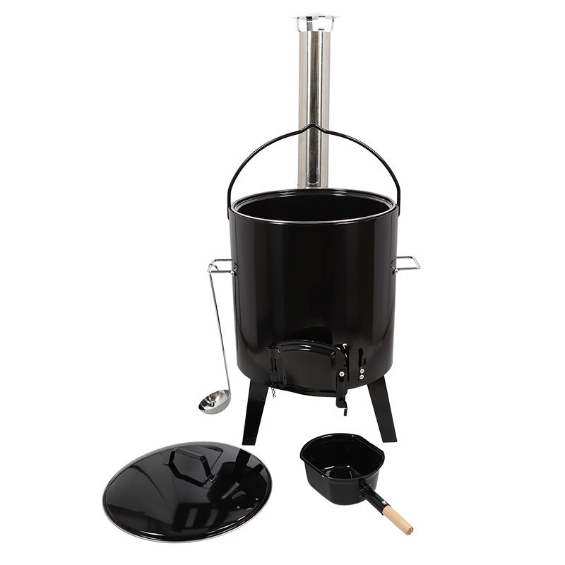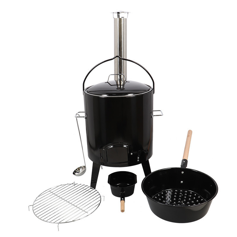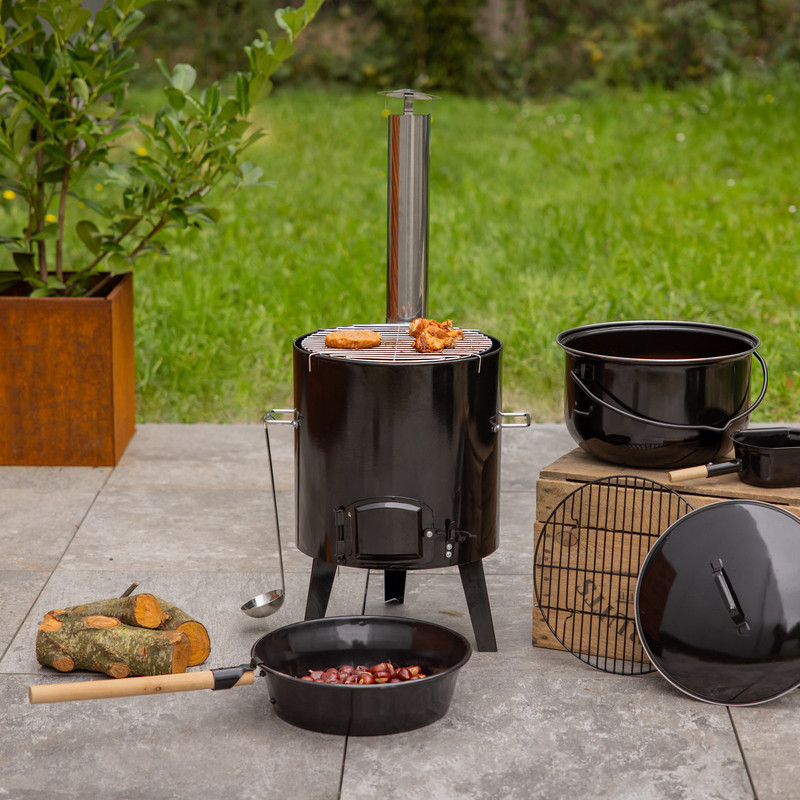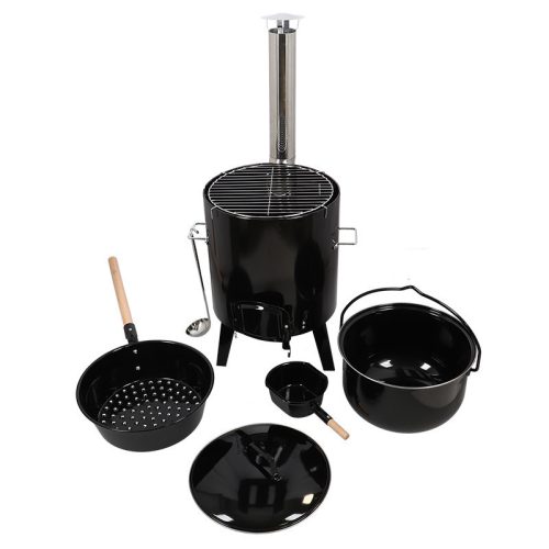 Többfunkciós kültéri fém főző szett. Ez a praktikus és kompakt főző szett számos előnyt kínál a szabadtéri főzés és kempingezés szerelmeseinek. Úgy tervezték, hogy kompakt és könnyű legyen, így egyszerűen szállítható. Ideális választás akár túrázásra, piknikre és kempingezésre is. Minőségi anyagból készült, kompakt kialakítása pedig egyedi a piacon. Több elemből áll, mint például üst, grillrács, fazék fedővel, gesztenyesütő serpenyő, kisebb edény lehetővé teszik az ételek széles választékának elkészítését. Ez a sokoldalúság alkalmassá teszi különféle ételek főzésére a pörkölttől a BBQ-ig. A fazekak és serpenyők tároláskor egymásba rakhatóak, így kevés helyet foglalnak. A termék színes díszdobozban érkezik.