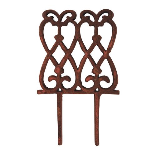 Öntöttvas ágyásszegély klasszikus mintával, amely kerti kerítésként is használható és ágyások szétválasztására is alkalmas. Masszív anyaga miatt a fa,- és egyéb ágyásszegélyekkel szemben sokkal időtállóbb. Látványos, könnyen leszúrható és egyszerűen áthelyezhető kerti dekoráció. Rusztikus hangulatot csempészhetünk vele otthonunkba. Öntöttvas jellegéből adódóan külső elhelyezés esetén, a korrózió megjelenésével egy patinásabb, rusztikusabb termék válik belőle.