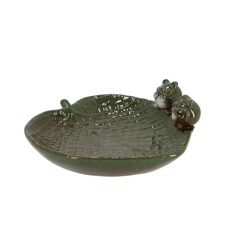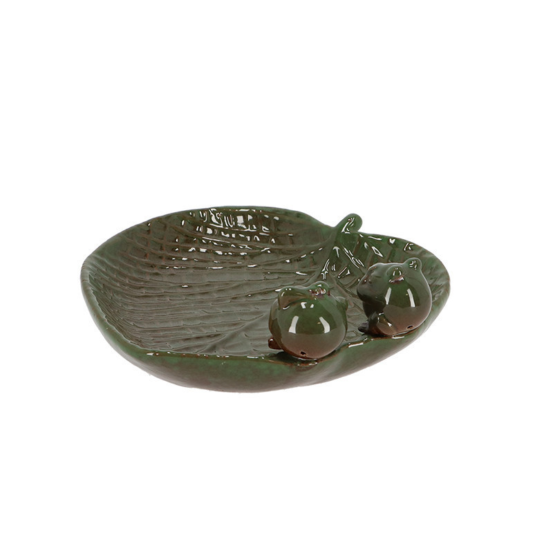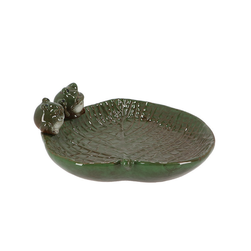 Levél alakú kerámia madáritató és madáretető, béka dekorációval