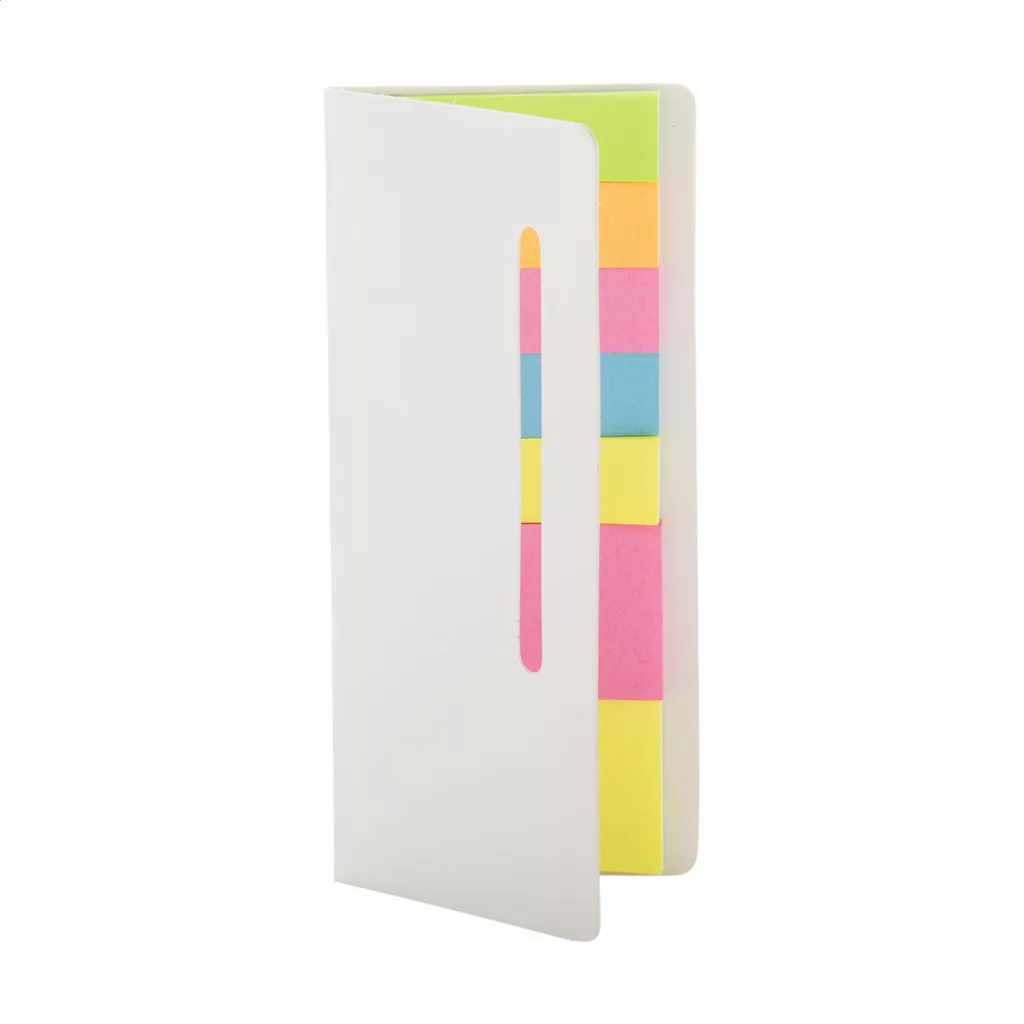 Különböző méretű öntapadós jegyzetlapok (2×20 db közepes és 5×20 kicsi), papír tokban.