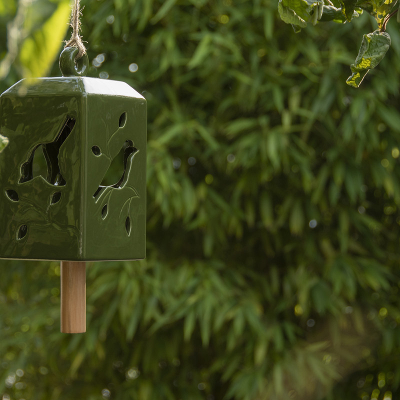 Rusztikus megjelenésű szélcsengő olivazöld színben. Használhatjuk a kertben, az erkélyen, a teraszon vagy akár otthonunk belső helyiségeiben is. Tedd vele különlegessé környezeted! Hideg időjárás esetén nem ajánlott a terméket a szabadban hagyni, mivel a fagy okozhat sérülést vagy repedést a kerámia felületén.