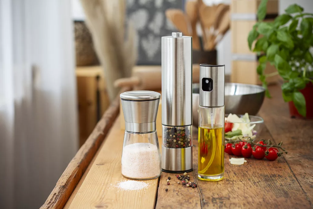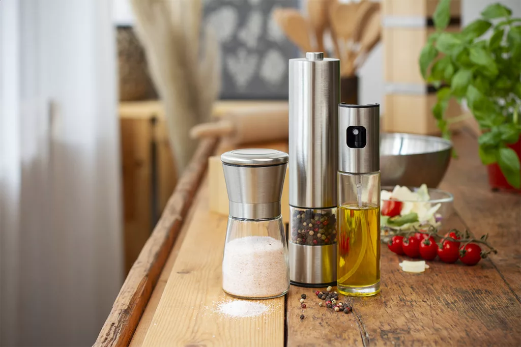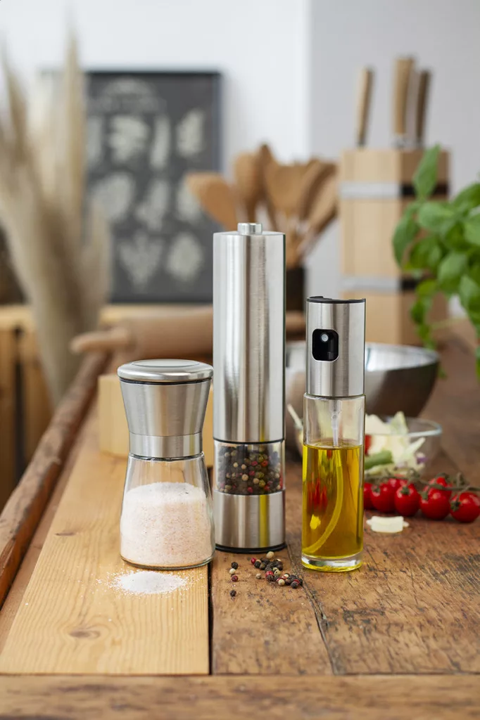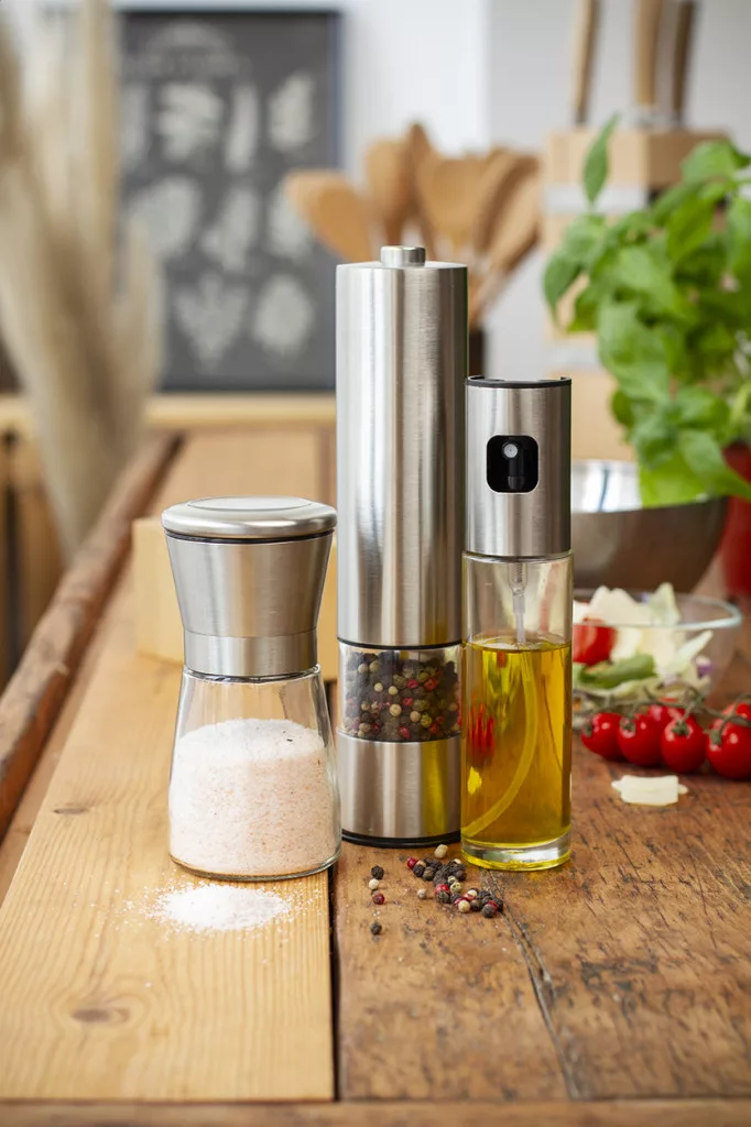Rozsdamentes acélból készült elektromos só- és borsőrlő kerámia részlettel és LED lámpával. 4 db AA elemmel működik, elem nélkül szállítjuk.