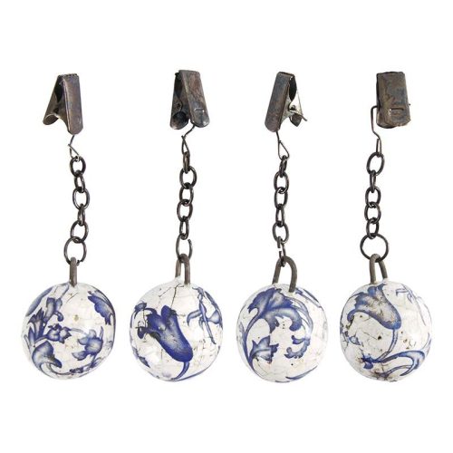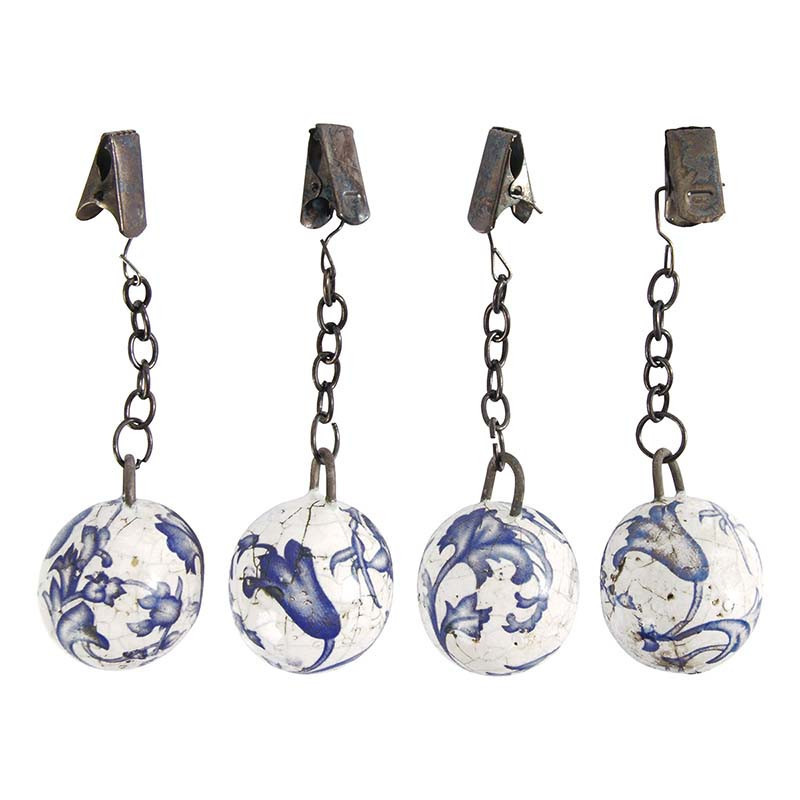 Négy darabos, kék-fehér virágmintás kerámia terítőnehezék gömb. Praktikus kellék, amely szelesebb időjárásban is az asztalon tartja a terítőt. A négy nehezéket az asztalterítő sarkaira kell csíptetni, így a szél nem kapja fel. Hideg időjárás esetén nem ajánlott a terméket a szabadban hagyni, mivel a fagy okozhat sérülést vagy repedést a kerámia felületén.