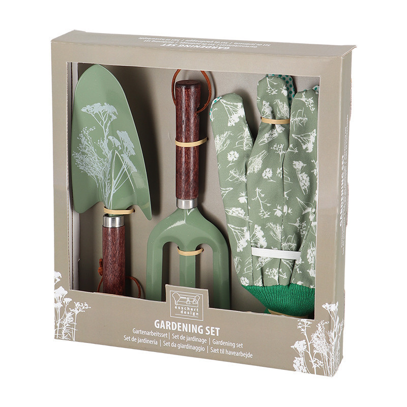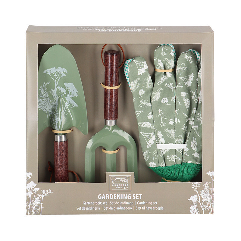 Mezei virág mintás kerti eszköz és kesztyű szett, zöld színben.