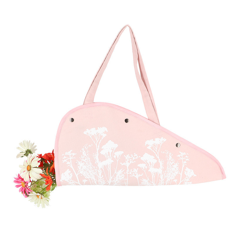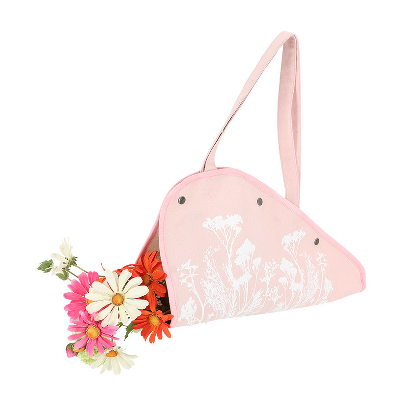 Mezei virág mintás virágtartó táska, pink színben. Segítségével sérülésmentesen szállítható a piacon vásárolt vagy általunk szedett virág otthonunkig. Egyszerűen helyezzük a virágokat a nyitott táskára, majd zárjuk le a 3 patent segítségével. Koptatott hatású vászon virágtartó táska.
