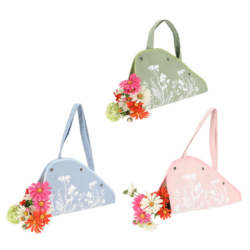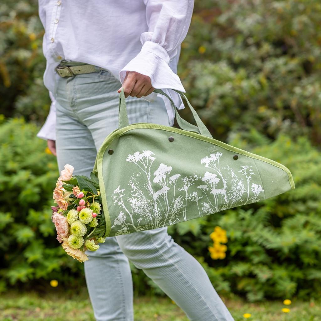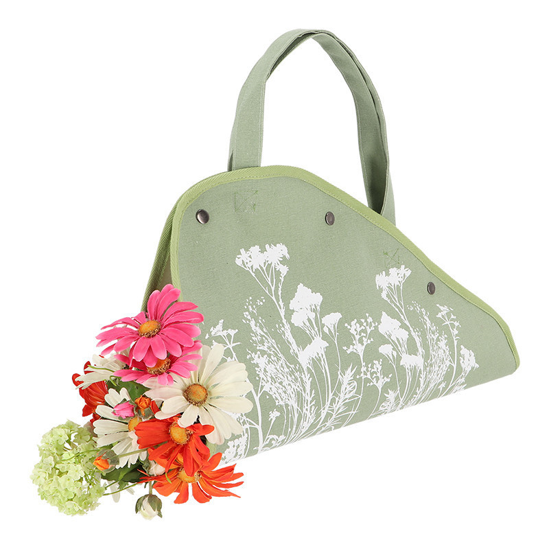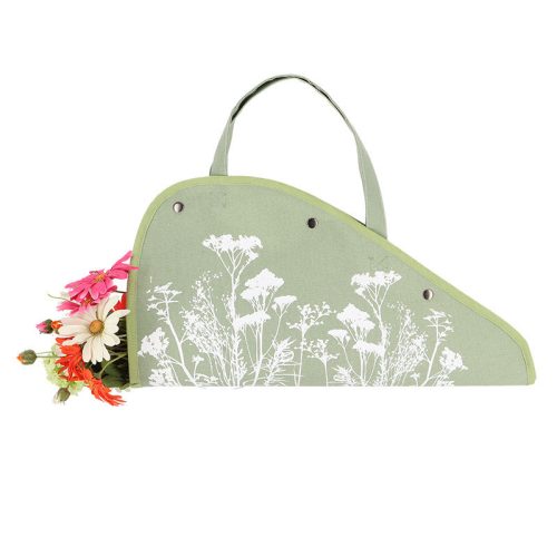 Mezei virág mintás virágtartó táska, zöld színben. Segítségével sérülésmentesen szállítható a piacon vásárolt vagy általunk szedett virág otthonunkig. Egyszerűen helyezzük a virágokat a nyitott táskára, majd zárjuk le a 3 patent segítségével. Koptatott hatású vászon virágtartó táska.
