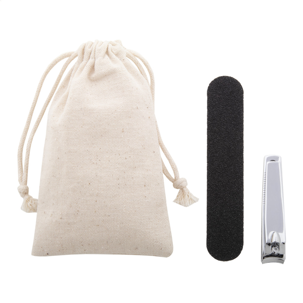 Manikűrkészlet összehúzható pamut tasakban. Egy körömcsipeszt és egy körömreszelőt tartalmaz.