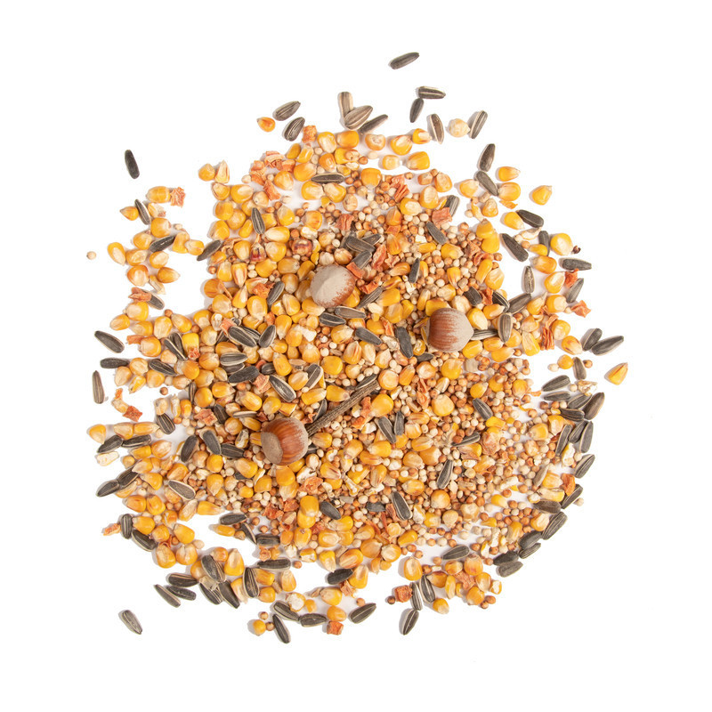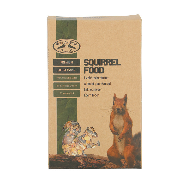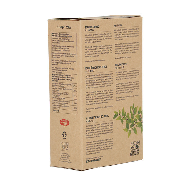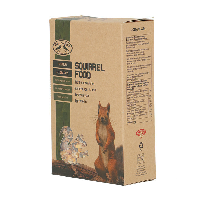 Mókus eleség vadonélő mókusok számára. Egész évben használható, olyan eleséget tartalmaz, amely a mókusok természetes táplálékát tökéletesen kiegészíti. Csomagolása újrahasznosítható papírdobozból és 100%-ban lebomló bio műanyagból áll.
