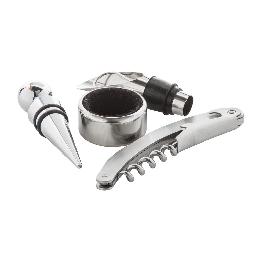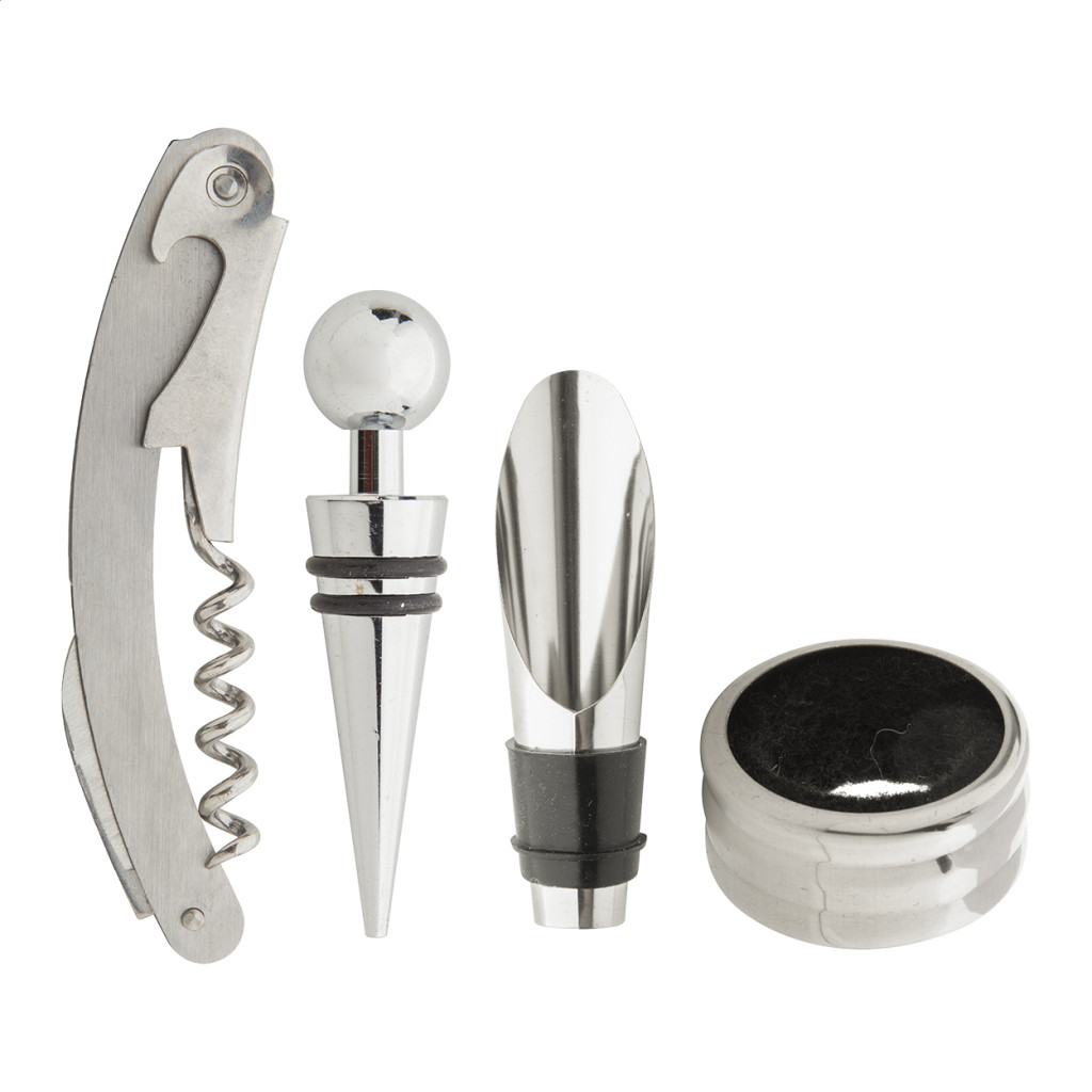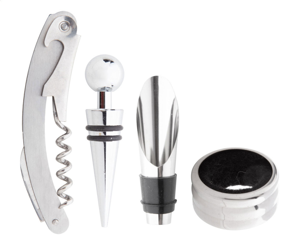 4 részes boros szett, mely dugóhúzót, cseppőrt, dugót és kiöntőt tartalmaz. Fekete díszdobozban szállítjuk.