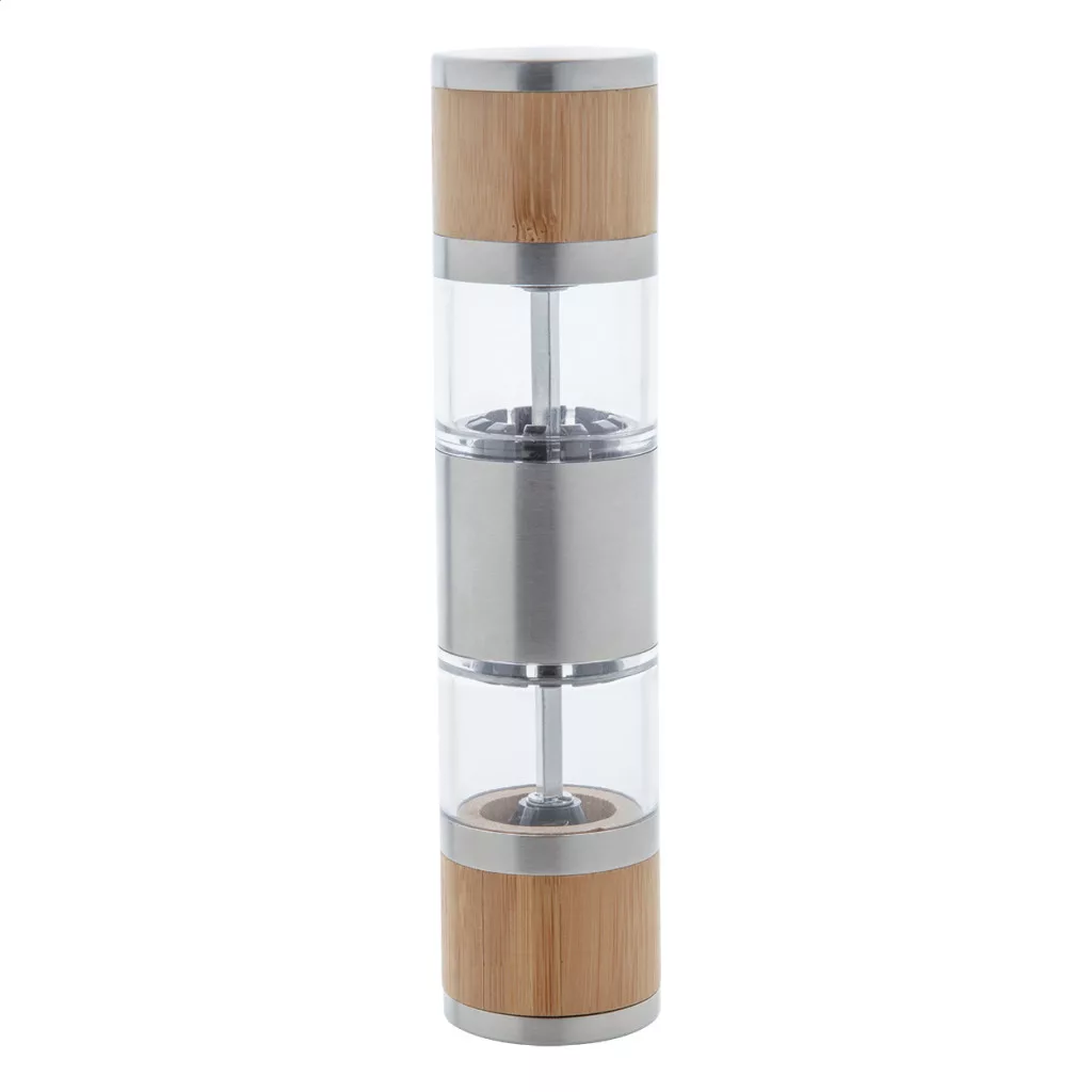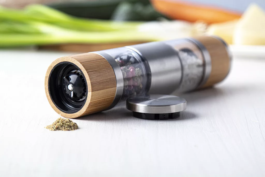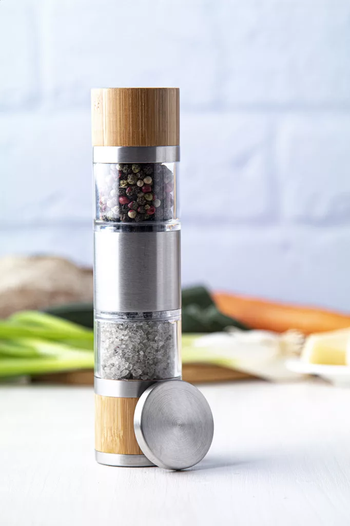Rozsdamentes acélból készült kézi só- és borsőrlő, bambusz borítással és kerámia őrlőszerkezettel.